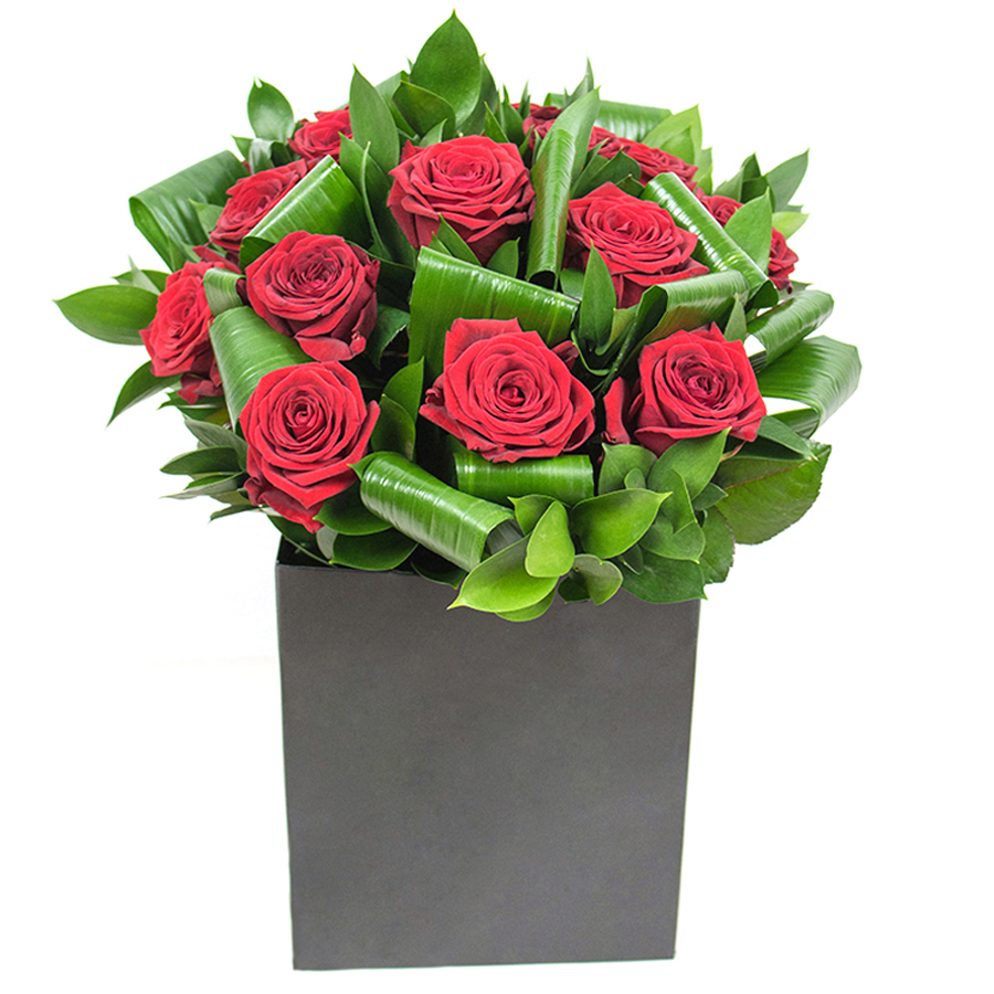 Experience harmony and beauty with our elegant red rose bouquet, featuring stunning red roses, lush aspidistra leaves, and graceful ruscus. This unique arrangement is crafted to add refinement and charm to any space.