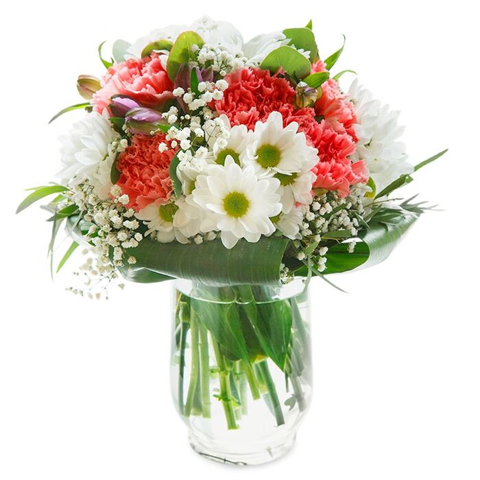 Delight someone special with our stunning floral arrangement, showcasing a soft color palette of snow-white chrysanthemums and gypsophila paired with light pink carnations. Each bouquet is expertly designed with vibrant aspidistra leaves, creating a visually captivating display.
